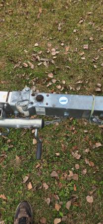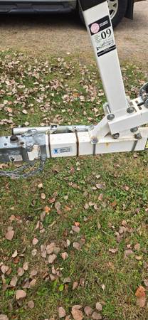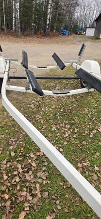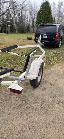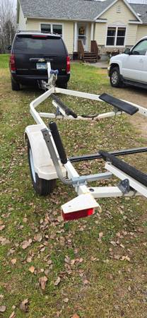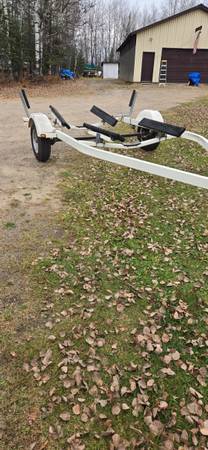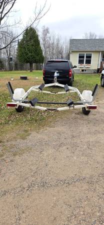 GOOD USED BUNK BOAT TRAILER 3000LB NEW TIRES, GOOD BEARINGS, LIGHTS WORK, SURGE BRAKES , LIFE TIME LICENSE, SWING AWAY HITCH.