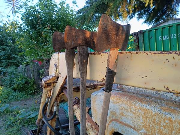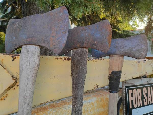 I have three double bladed axes all are old at least one is real old can't find any markings yet still Rusty unrestored asking $35 your choice located in Grand forks 701-739-32 34.