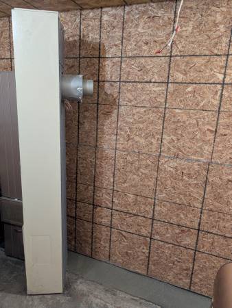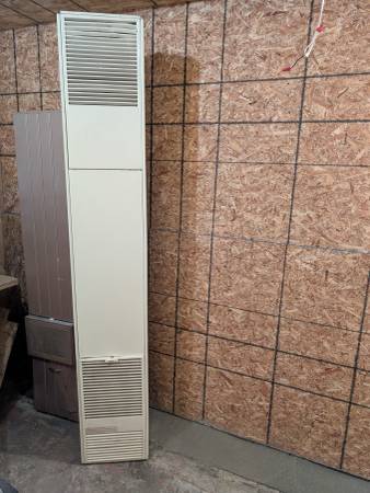 Furnace is a 67,500 BTU that can be natural gas or propane. The furnace was inspected and it looks like it has not had much use. The chimney exhaust out the wall. The temperature in the room is regulated by a fan & thermostat.
