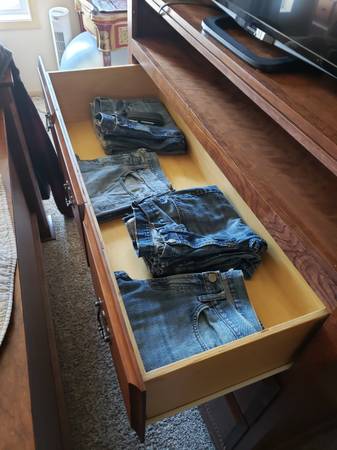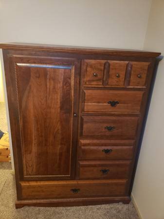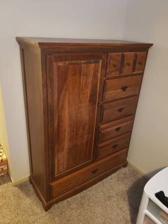 I have for sale an Armoire and Gentlemen's Chest made custom by Casey Anderson of T. Anderson Construction. They're both made of solid Cherry wood stained dark. Both in good/ great condition with a few small scratches that you can hardly see and the middle drawer on the Armoire is a bit difficult to close occasionally because the railing/ slides for the drawer are slightly bent from putting too much weight in the drawer. They are very large and you could probably fit your entire wardrobe plus a couple of blankets between the two of them. The Armoire is also large enough to fit a 45" LG Smart TV in the top cupboard area with a bit of room to spare. So, at night you can open up the cupboards to watch a nice sized TV in bed as you doze off.