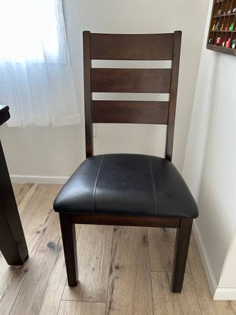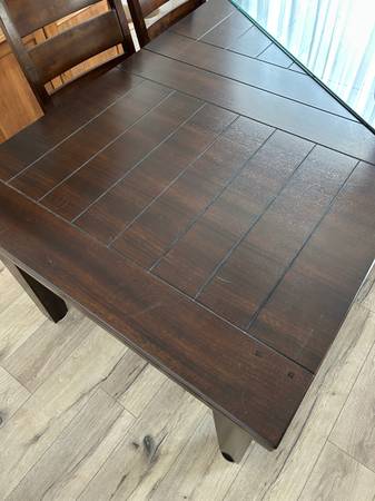 Table with table leaf, 8 chairs. Rarely used. Some wear and tear / scratches on 2-3 of chairs. Can be reupholstered. Tempered glass not included- but it is also for sale.