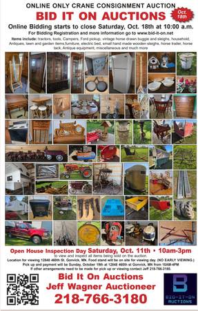 On line Only Auction closing 10am Saturday October 18th- bidding is open. Www.bid-it-on.net