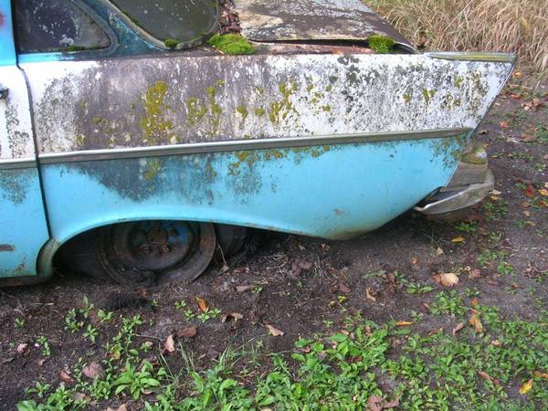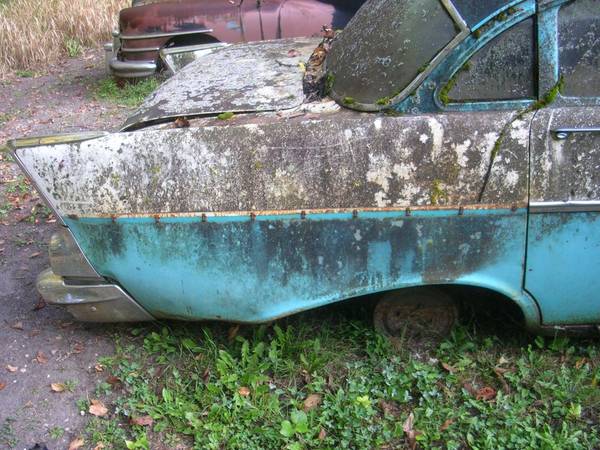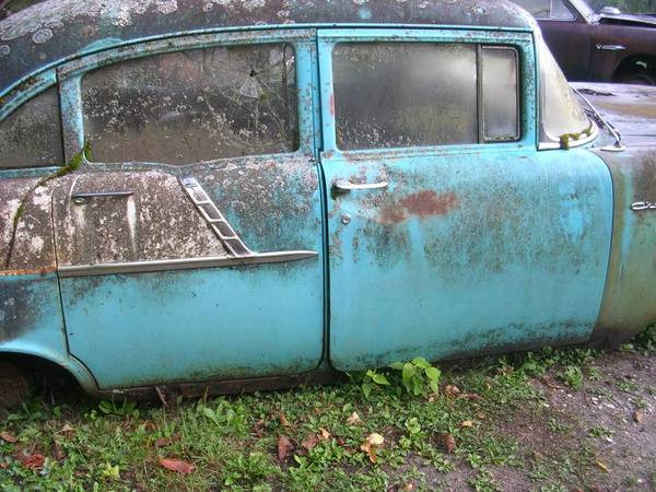 1957 Chevrolet 4dr Parts Car model 150, (sold as is) not selling parts off of it, no title, this has been sitting at the farm many years last licensed around 1971, 6 cyl under the hood, as you can see in the photos the rear bumper was damaged when we pulled it out of the bush line, and someone cut a piece of sheet metal out of the driver front door, $750, you would need a strong winch to load it on to a trailer as it does not roll is missing a few wheels and i have no way of helping you load it. May be easier if you bring wheels, nuts and a jack, Located at Greenbush Minnesota (way up North) Quite a few jerks think its a 55 or 56 do your research before you make a fool of yourself, its a 1957 Chevrolet 150 model