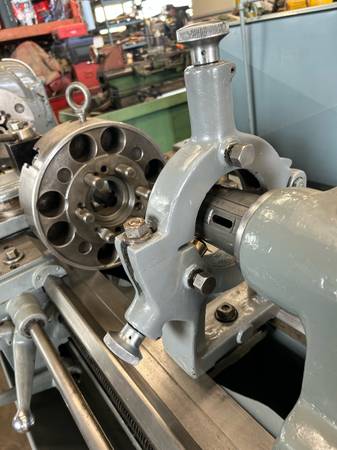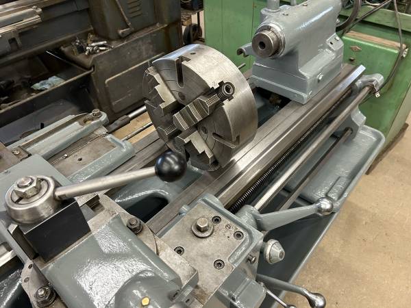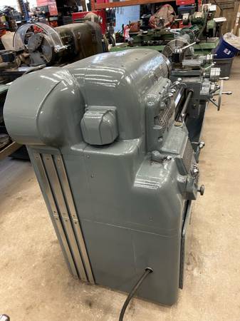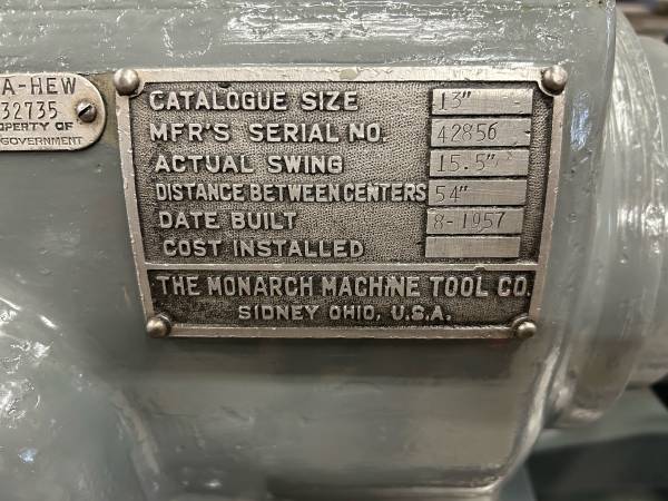 1957 Monarch Series 61 Toolmakers Lathe. Catalog size 13” with an actual swing of 15.5x54” between centers. Equipped with leadscrew reverse, full taper attachment with clamp, Enco CXA toolpost with 3 holders, Cushman 3 and 4 jaw chucks and some additional tooling. Has spindle speeds from 36-1500 rpm. Spindle bore is 1.3125”. Footprint is 9’x4’ and weight is 5000lbs.