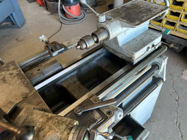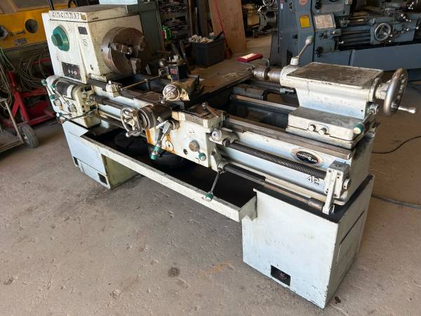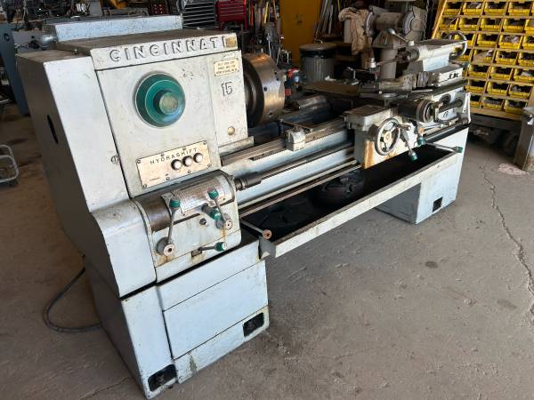 Cincinnati Hydrashift lathe for sale. This is a 15” swing by 42” between centers machine with taper attachment, 3 and 4 jaw chucks, Aloris BXA toolpost, Jacobs Superchuck, faceplate, work light, power feeds and threading. Spindle speeds from 37- 1470 rpm. The 3 jaw chuck is an Adjust-tru type with hard top jaws.