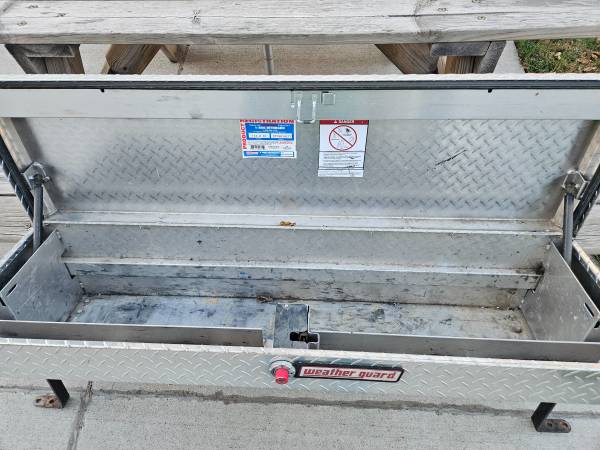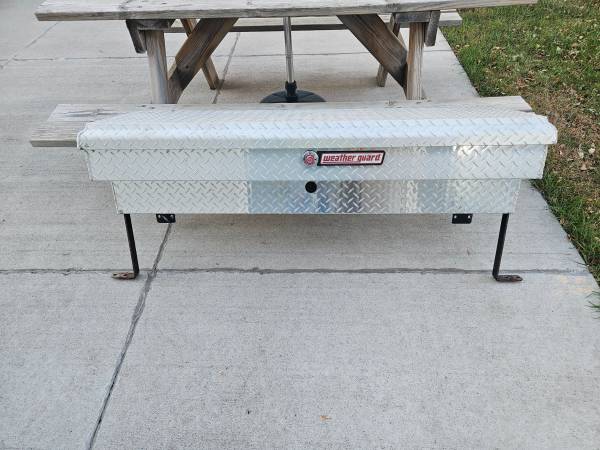 Nice weather guard side tool box with key. Dimensions are 56 inch long x 16 inches wide x 13 inches deep. Call .